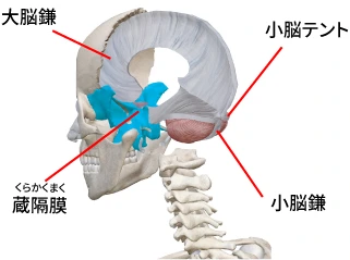 この4枚の骨の骨膜に強い歪みのテンションがかかることで、頭蓋骨の軸が乱れるのです。この骨の軸合わせを丁寧に行うことで、背骨に対して頭蓋骨が正しい位置に収まり、中枢神経の圧迫も取り除きます。